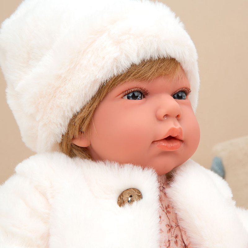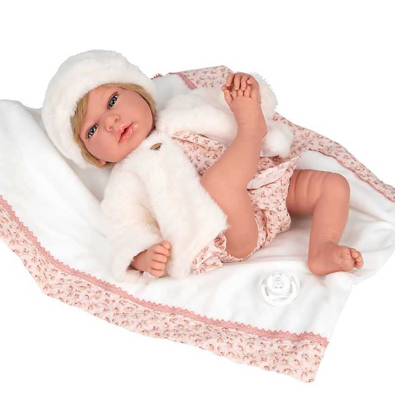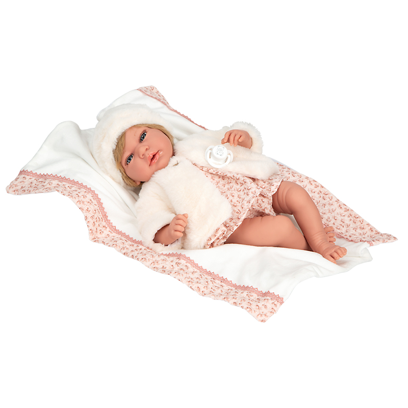 40 cm ANDIE ELEGANCE doll dressed in a pink dress, wool jacket and hat with a matching blanket. Their weight is so realistic that they feel just like a real baby. Includes a dummy and blanket. Andie is ready to spend the evenings having fun by your side. They’ll never get cold thanks to their soft and warm fleece jacket and hat, and their matching blanket. Their most special feature is that they weigh the same as a real baby. They also have a soft vanilla scent. High quality fabrics have been used to make their clothing and blanket, to which a very special design has been applied. Includes a dummy and blanket. 46,5×21,50×30
