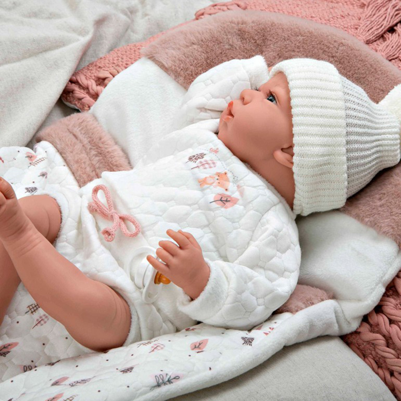 ELEGANCE 40 cm ANDIE doll dressed in an outfit in light tones with a quilted texture to which an autumnal design has been applied. Its weight is so real that it looks like a real baby. Includes sleeping bag and pacifier. 46,5×21,50×30