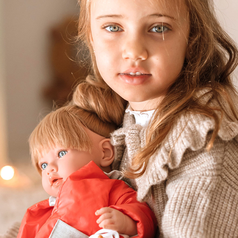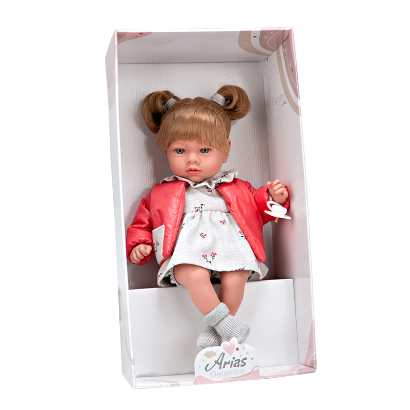 Aria is ready to go to the park and play with you all afternoon. She’ll love going down the slide and collecting fallen leaves from the trees. If you squeeze her tummy tight, she’ll laugh. In addition, her vinyl head and limbs give off a soft vanilla scent. She is wearing a little coral red jacket to match her little grey dress with floral motifs. Accessories include a dummy26x16,5×48
