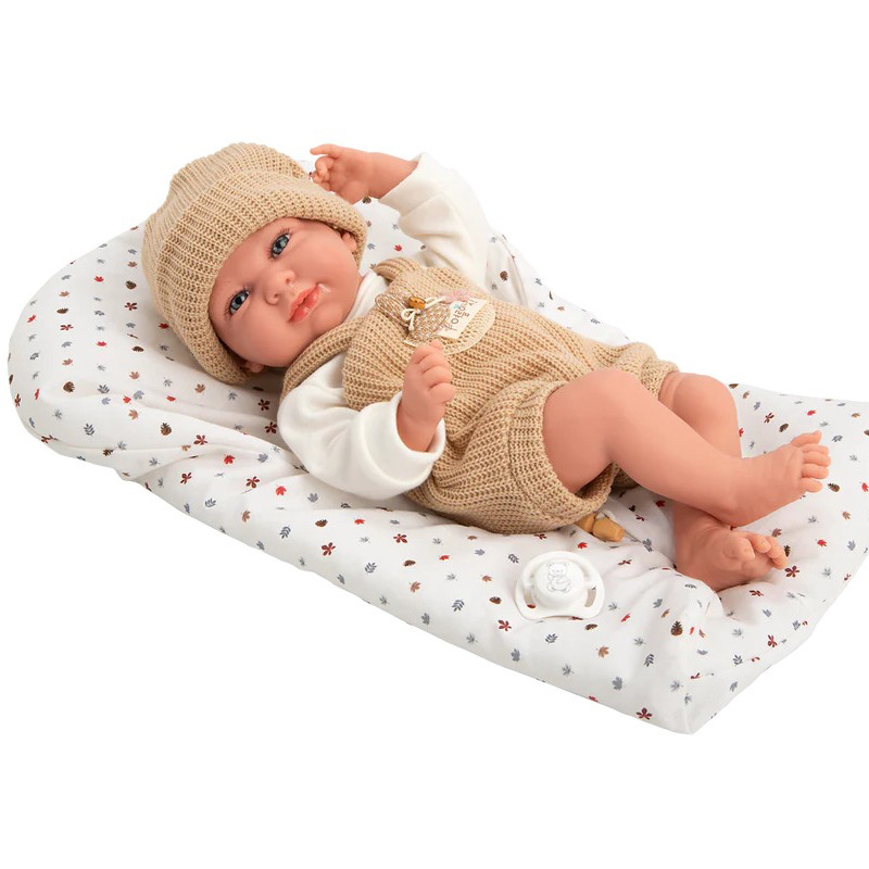 ELEGANCE 40 cm CRIS doll dressed in a beige dungarees, with matching hat and sleeping bag. Its weight is so real that it looks like a real baby. Includes pacifier and sleeping bag. 46,5×21,50×30