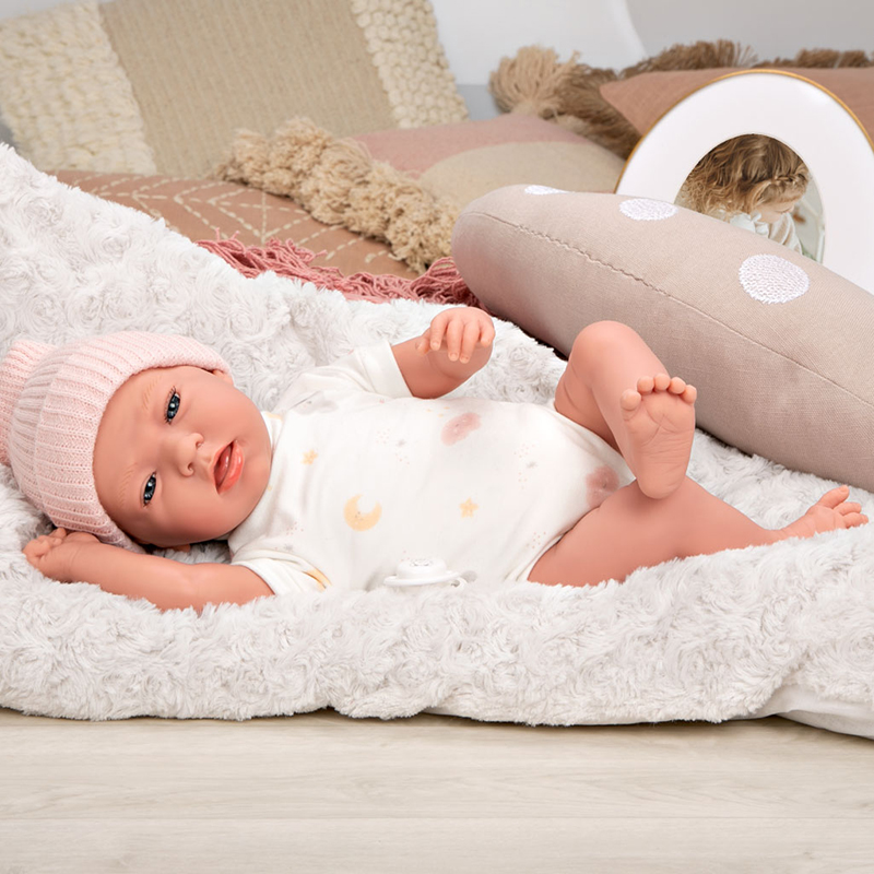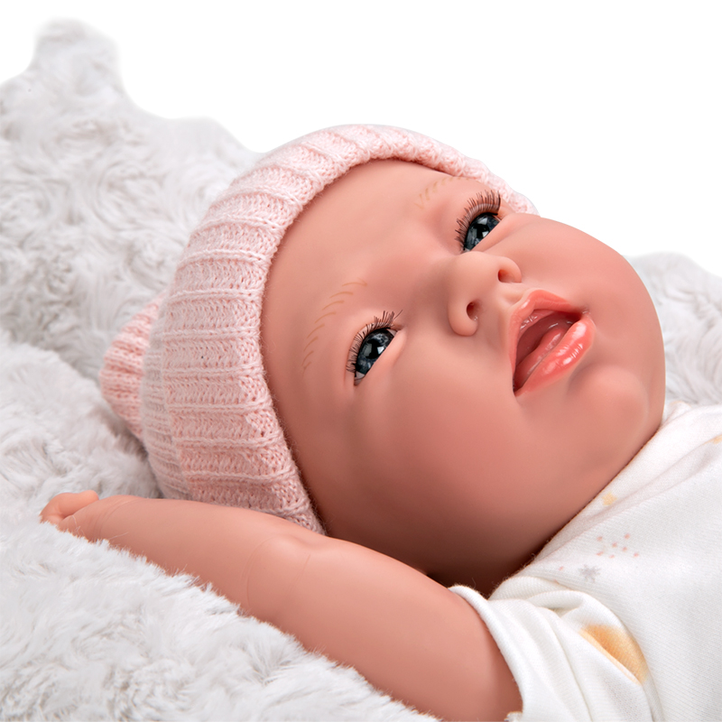 This special baby can’t wait for you to rock her to sleep on her fluffy cushion at nap time. Daphne weighs the same as a real baby and gives off a soft vanilla scent thanks to the vinyl material of her limbs and head. Her pyjamas, hat and blanket are made of high quality fabrics. Includes a dummy.46,5×21,50×30