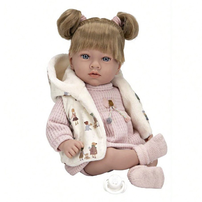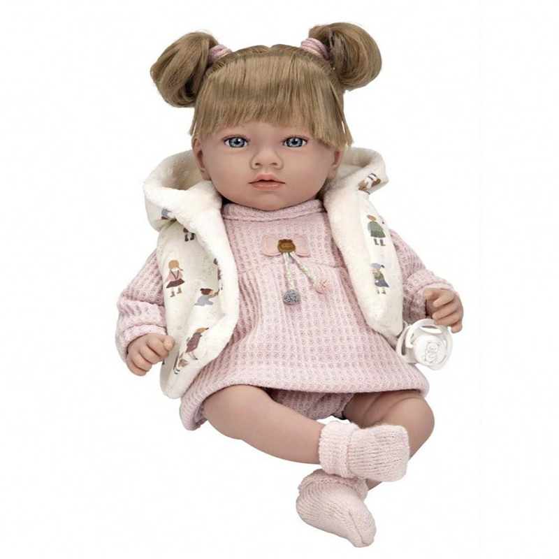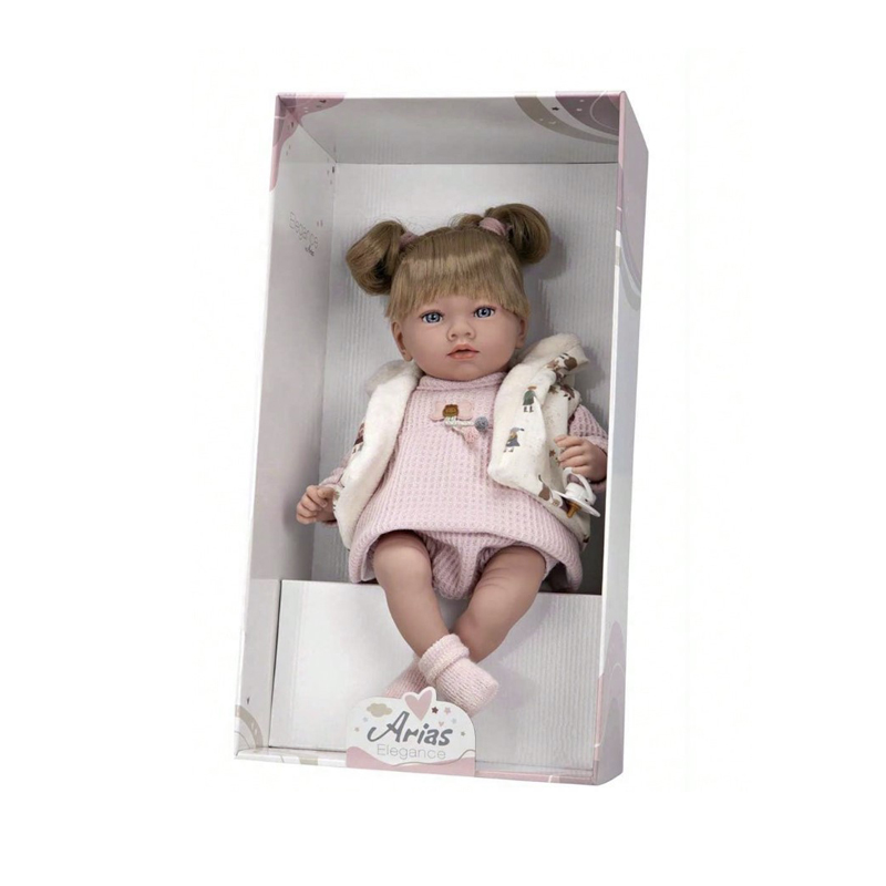 ELEGANCE 40 cm ARIA doll with laugh mechanism. Dress in pink tones and autumn print. Includes pacifier. Aria is ready to go to the park and play the whole afternoon with you. You’ll love going down the slide and picking up deciduous leaves from the trees. If you squeeze his belly, he will laugh. In addition, its vinyl head and limbs give off a soft vanilla aroma. She wears a very autumnal vest and a pink dress. Includes a pacifier as an accessory. 26×16,5×48