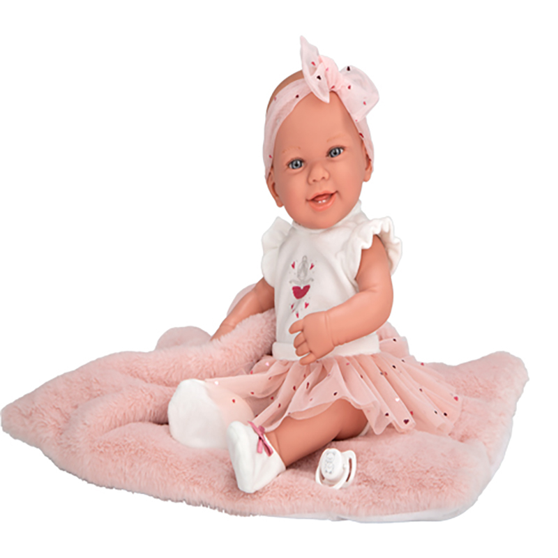 42 cm ELEGANCE ZOE doll with full vinyl body. Ballerina dress in pink and white tones with heart-print tulle skirt and matching pink fur cushion. Accessories include dummy and cushion.