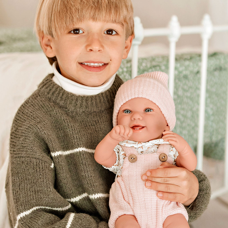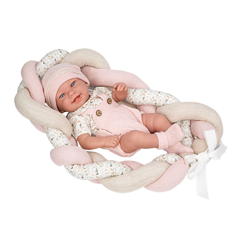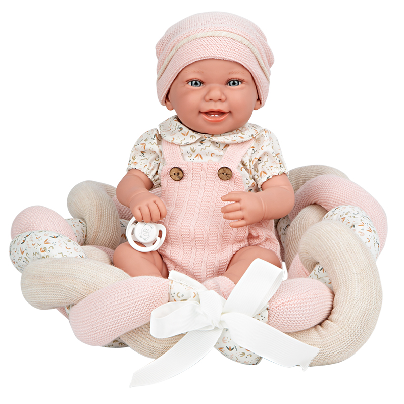 ELEGANCE 42 cm ZOE doll with vinyl body and limbs. Dressed in a powder pink romper suit and printed shirt to match her cushion. Includes dummy. Zoe will want to take a nap with you thanks to her matching cushion, powder pink romper and floral shirt. Her vinyl body and limbs give off a soft vanilla scent. A dummy is also included as an accessory. 26×16,5×48