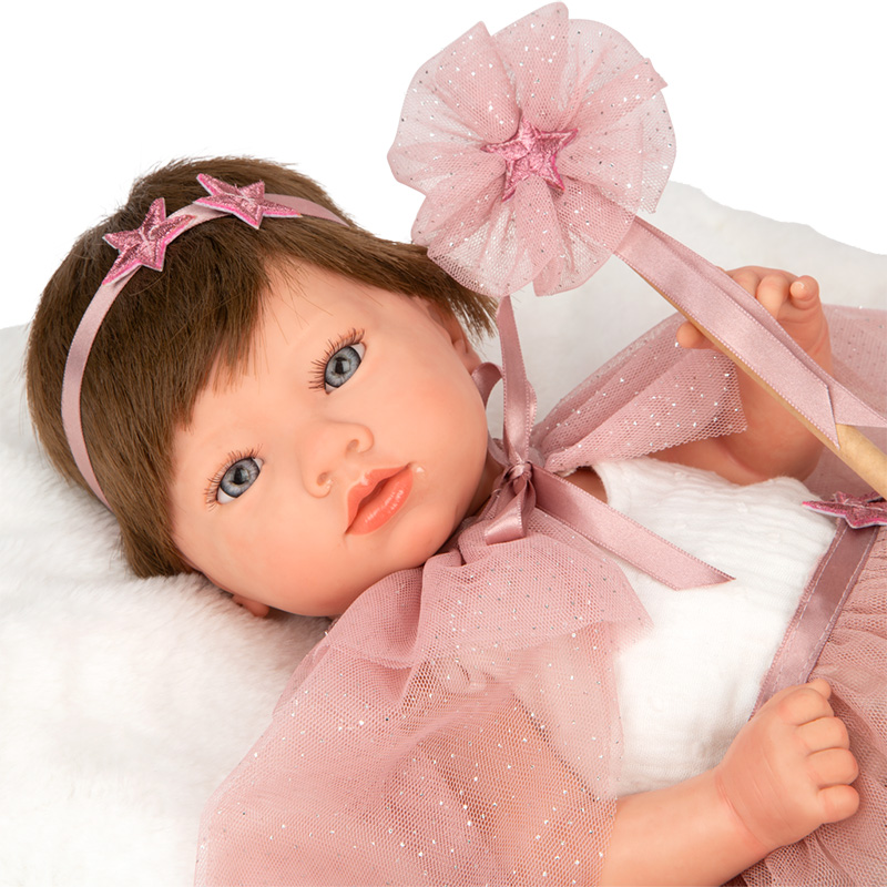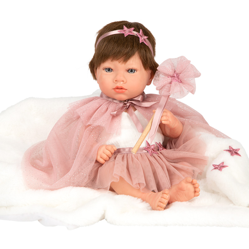 38 cm PRINCESS reborn. Realistic baby with vinyl body and limbs with pink-and-white-toned clothing, matching cape, sparkly wand and fur blanket. Includes blanket, dummy, dummy holder, nappy, family record book and certificate of authenticity.Little Princess is pure sweetness. Little ones at home will love sharing the sweetest and funniest moments with this reborn baby. They’ll spend hours playing with their sparkly wand and tucking them in with their soft blanket. Their entire body is made of vinyl, a high quality and very soft material, which allows for the application of very realistic details, such as rosy cheeks, delicate veins or nail decoration. Their pink-and-white-toned clothing and blanket are made using high quality fabrics. Accessories include blanket, wand, diaper, family record book and certificate of authenticity. 52x20x30