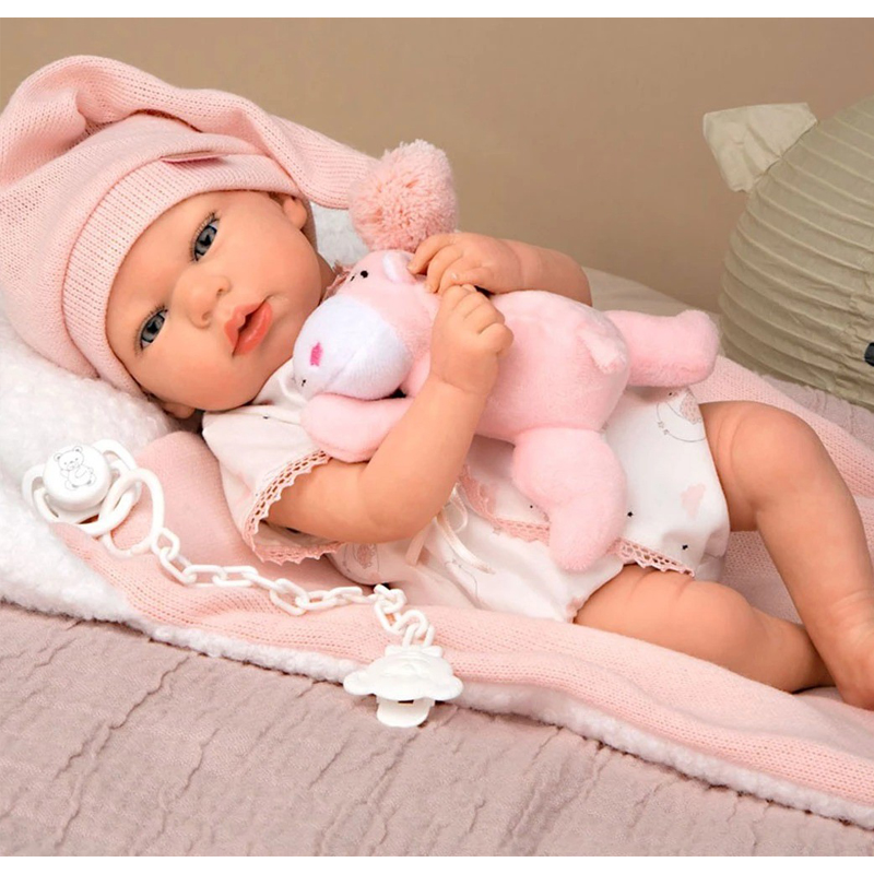 Little ones will share the sweetest moments with little Ariel. This reborn baby is pure sweetness and loves to snuggle into their soft cushion and sweet soft toy. They are handmade and have a pleasant vanilla aroma. Soft to the touch, with a soft, bead-filled body that provides stability and weight. Their arms and legs are made of vinyl, a high quality and very soft material, which allows for the application of very realistic details, such as rosy cheeks, delicate veins or nail decoration. Their pink-and-white-toned clothing and cushion have been made using high quality fabrics and taking care of every detail of its design. Accessories include cushion, teddy, dummy, dummy holder, nappy, family record book and certificate of authenticity.52x20x30