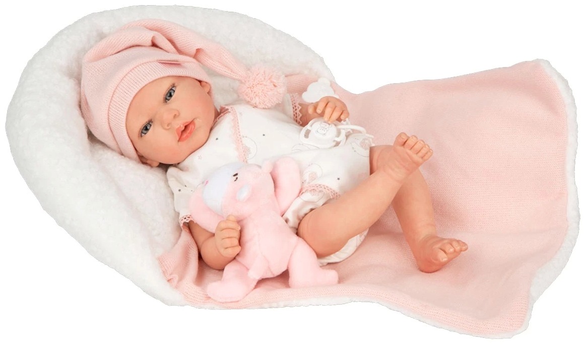 40 cm ARIEL Reborn. Realistic vinyl baby with soft body dressed in a beautiful printed outfit and matching hat, and a beautiful sleeping bag. Includes sleeping bag, dummy, dummy holder, nappy, family record book and certificate of authenticity.