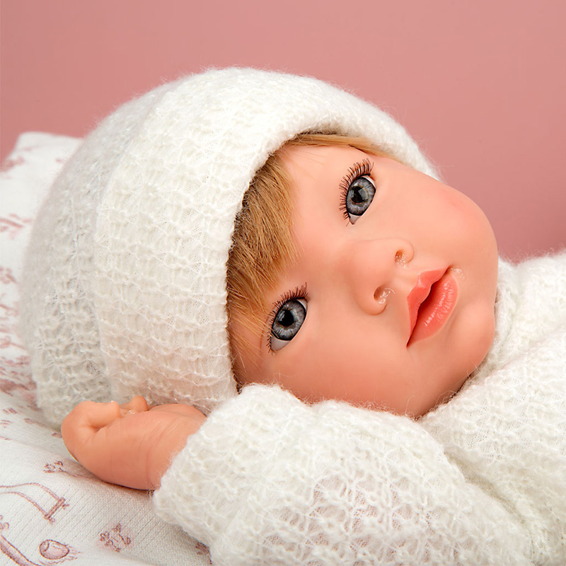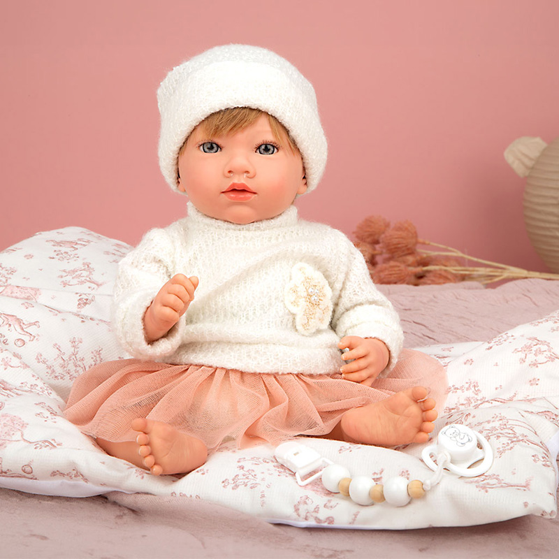 40 cm JULIA reborn. Realistic vinyl baby with soft body and pink-and-white-toned clothing and matching pink patterned cushion. Includes cushion, dummy, dummy holder, nappy, family record book and certificate of authenticity. Little Julia’s expression is delicate and meaningful. This baby loves snuggles and hugs. They have been handcrafted taking care of every detail. Their sweet vanilla scent means you won’t want to put them down. Bead-filled to provide stability and weight to the baby. Their head, arms and legs are made of vinyl which allows for the application of very realistic details such as rosy cheeks, drool, delicate veins or nail details. Their clothes are made using high-quality fabrics with great attention to detail in their outfit and colour combinations. Accessories include cushion, dummy, dummy holder, nappy, family record book and certificate of authenticity. 52x20x30