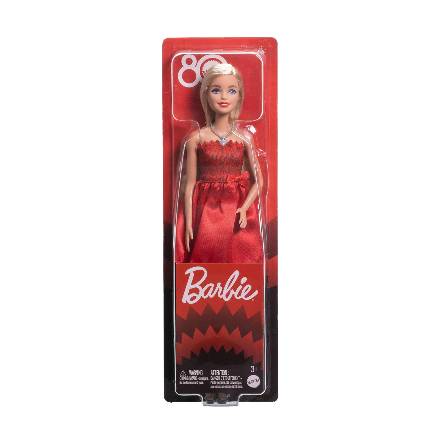 The Barbie brand marks Mattel’s 80th anniversary with a collectible doll in a celebratory look! Barbie doll honors the company’s long legacy of play in a ruby-red party dress with beautiful details, like a festive bow and a bodice featuring a design inspired by the iconic toy company logo. Silvery heeled sandals and a matching necklace complete her look. Barbie fans and kids ages 3 years and older will love celebrating this special occasion alongside this collectible doll. Doll cannot stand alone. Colors and decorations may vary.