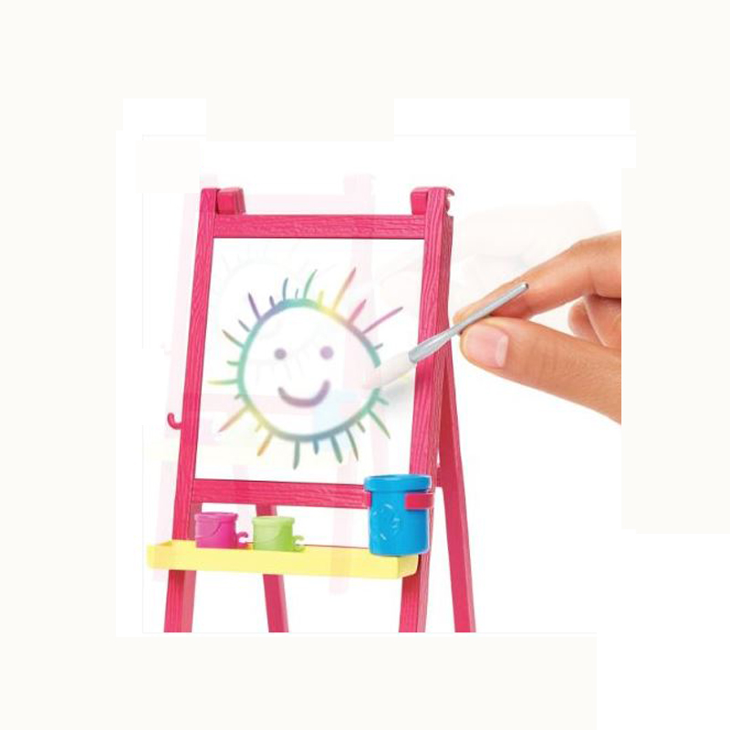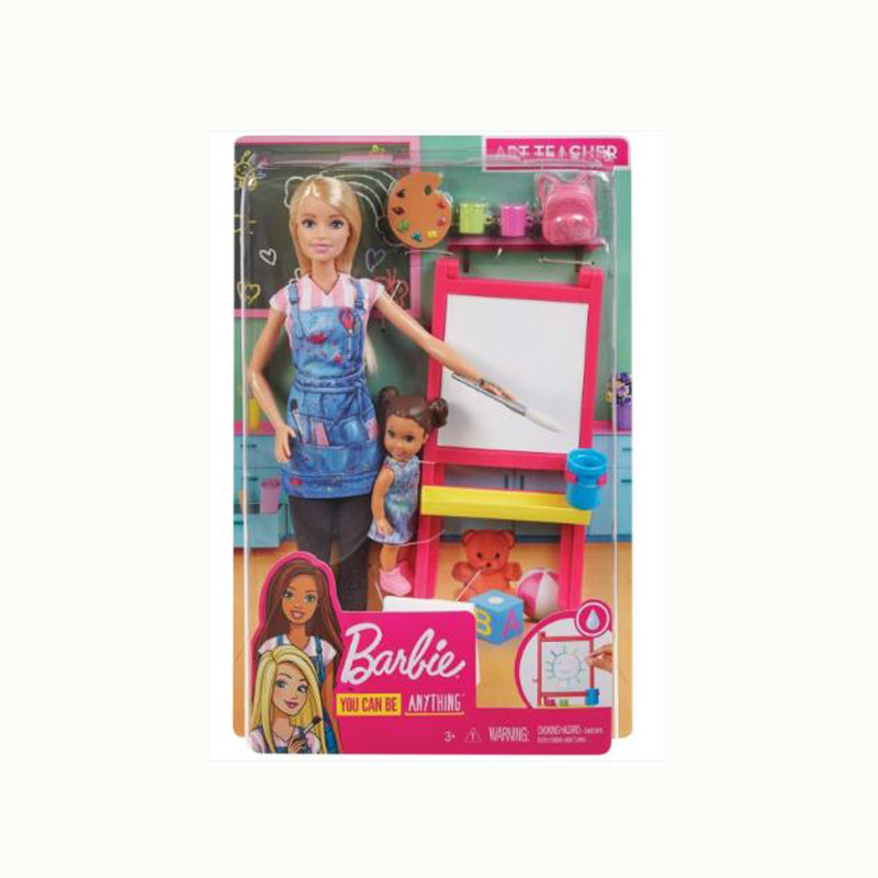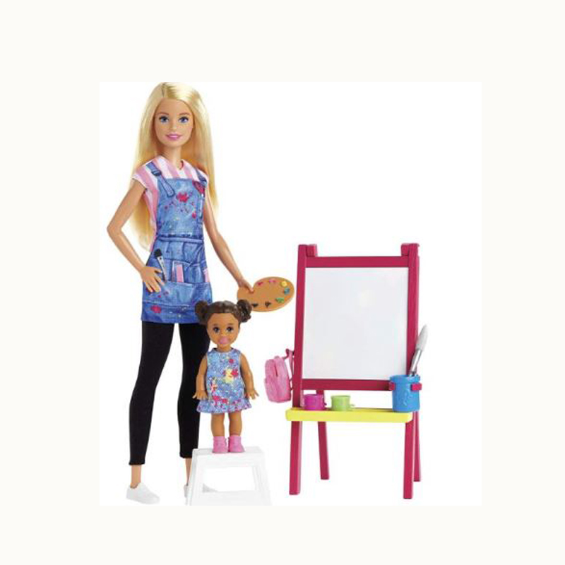 You can be an art teacher with the Barbie Art Teacher playset! Includes art classroom environment with Barbie Art Teacher doll, her adorable toddler student doll and toy art play pieces for learning and creative expression. Barbie Art Teacher shows her adorable student how to paint at the easel with a fun color-change surprise: dip the brush (included) in water and paint over the blank surface and the painting magically appears! Create again and again by wiping off the surface. Wearing leggings, a T-shirt, tennis shoes and a cute denim art smock, Barbie Art Teacher doll is ready to teach her eager-to-learn toddler student doll, who wears a cute dress and carries a backpack! Toy play items include an easel and painting surface, paint and water “containers,” palette, brush and toddler step stool.