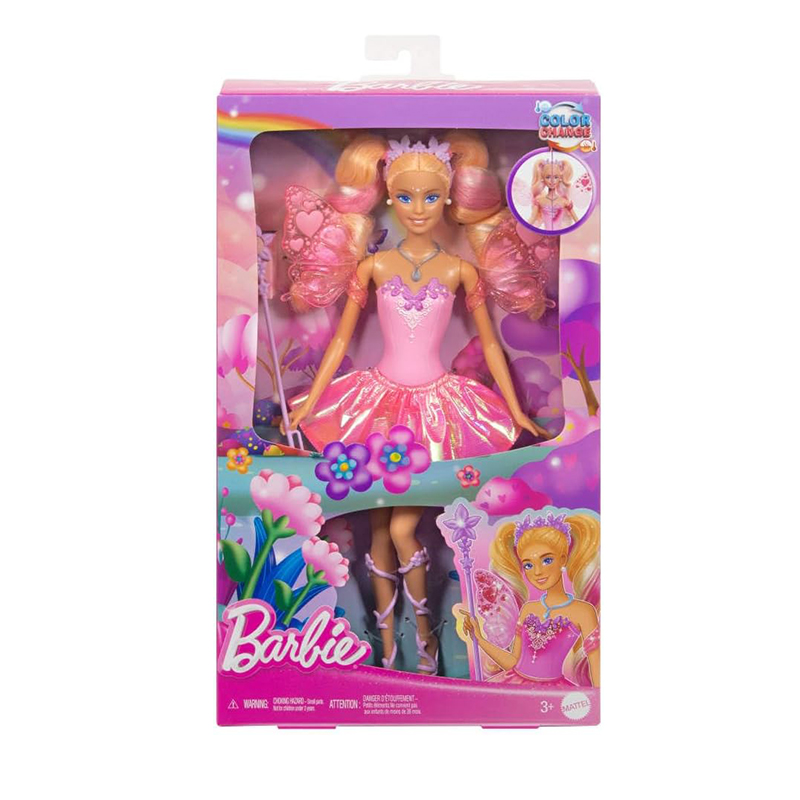 Make some color magic with this Barbie fairy doll! Dip her starry wand sponge in cold water, then swipe her wings to change the hearts from pretty pink to dazzling red! ‘Wave’ the wand onto her bodice for an enchanting ombre reveal. Change back with warm water for repeat color magic fun. This Barbie Fairy doll shimmers in her dress, vine-wrap heels, butterfly headband, and waterdrop necklace — leaving a little sparkle wherever imaginations go! Colors and decorations may vary.