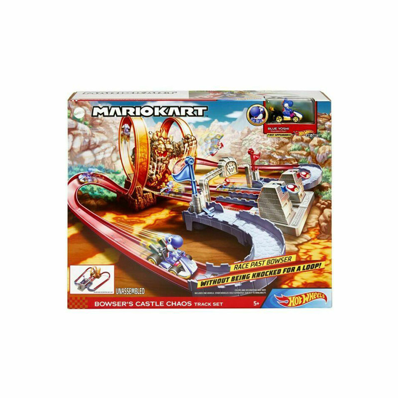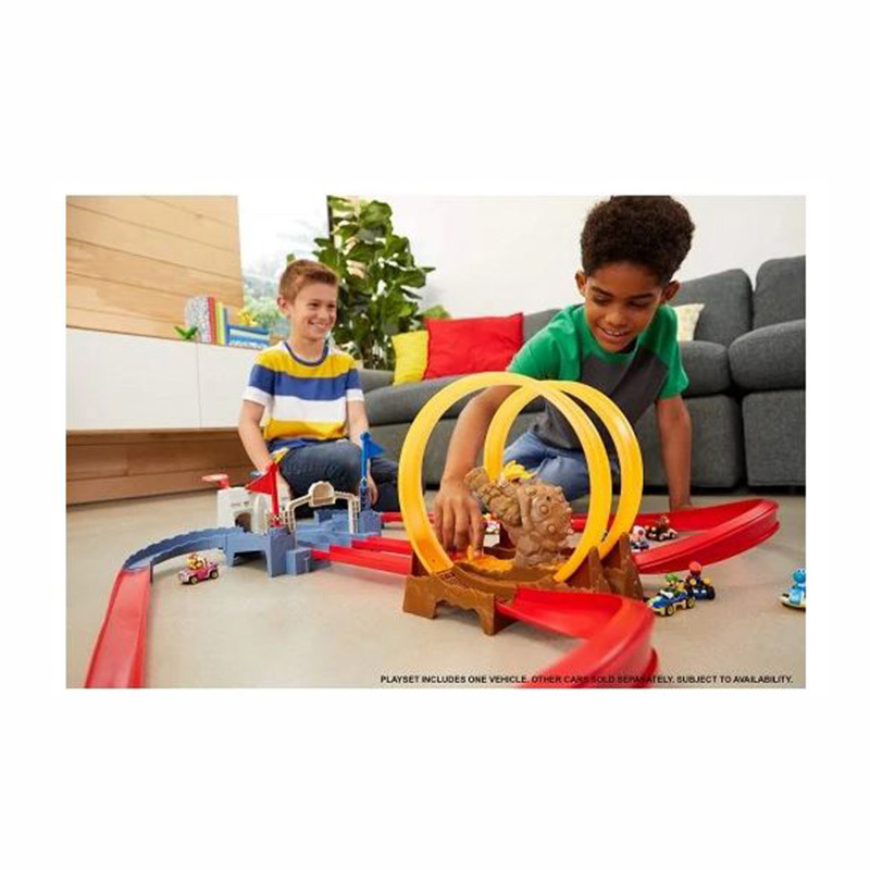 Kids can race their Hot Wheels Mario Kart replica vehicles to overcome the baddest Mario Kart nemesis — Bowser! Side-by-side racing, counting lap flag and reconfigurability makes this track set a thrilling experience. Kids must dodge Bowser’s fists to get past him, around the banked turn, and complete 5 laps to beat their opponent and win the race. Includes one replica die-cast Yoshi vehicle. Up the level of difficulty and amp up challenges by reconfiguring the track and connecting the Piranha Plant, Thwomp Ruins track sets and the Mario Kart Circuit track set (sold separately)