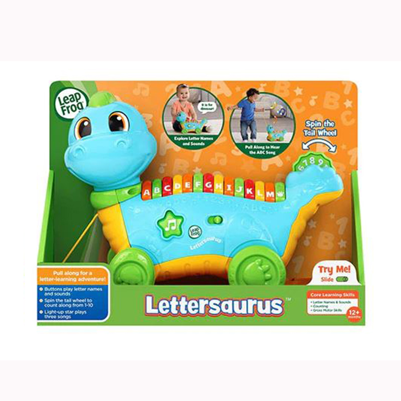 This adorable alphabet dinosaur has colourful letter buttons on his back that lets kids explore letter names and the sounds they make. Press the dino or footprint button to hear friendly phrases or add sounds to a jungle beat. Spinning the tail wheel introduces numbers and plays a counting song. For more music, pressing the light-up star button plays three upbeat songs. The dinosaur toy is also a pull toy that turns his head side-to-side as he wobbles along.
