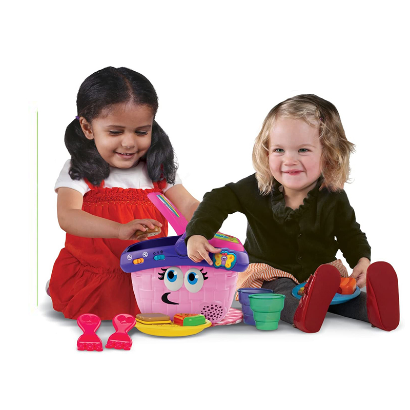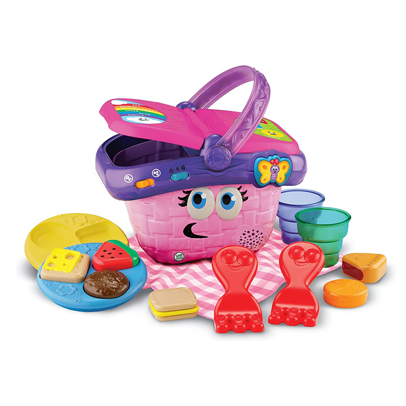 Learn about colors, shapes, manners and more while on a pretend picnic with the Shapes & Sharing Picnic Basket. Lift the lid to hear cheerful phrases and unpack the 15 play pieces, including colorful plates, forks, cups and food. The interactive shape sorter on the lid recognizes the food pieces and says the shape and color of each one. Hear polite food requests and delightful learning songs by pressing the butterfly button. Drop the correct food in the basket for rewarding responses that encourage good manners. Learning’s a picnic with this friendly basket!