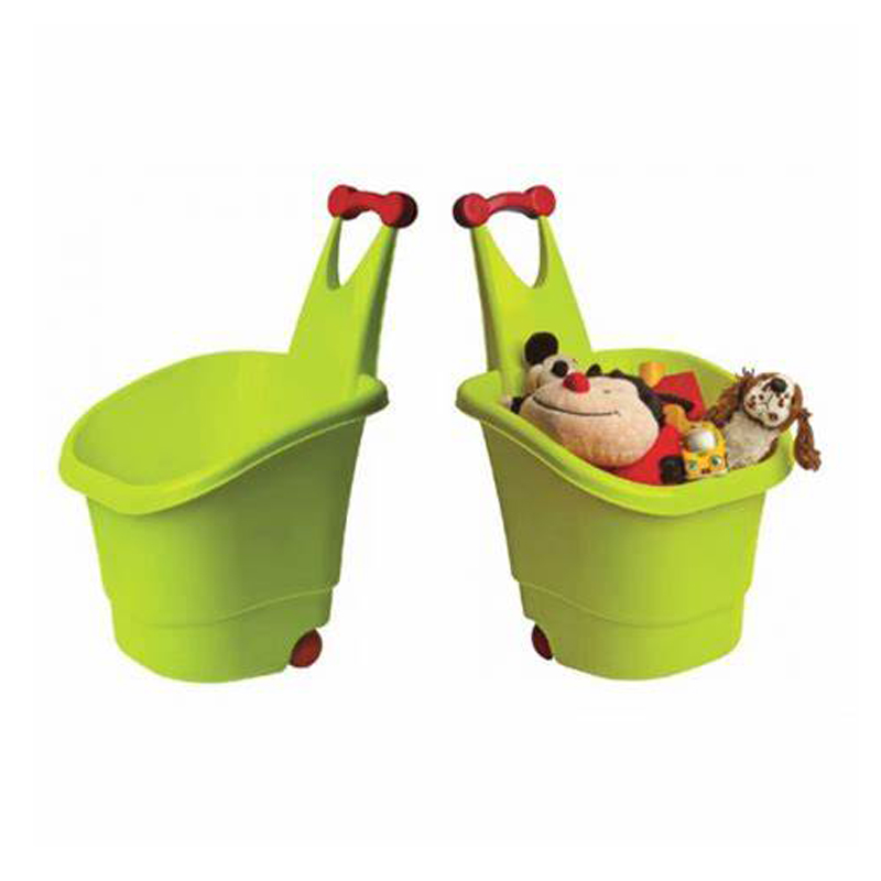 Practical plastic trolley for collecting and transporting toys. Equipped with plastic handle and wheels. Trolley dimensions 43 x 42 H 60 cm.