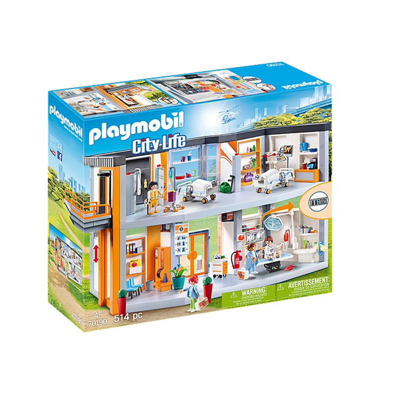 Getting better is easy in the large PLAYMOBIL Hospital. In its bright, friendly rooms and thanks to ultra-modern equipment and dedicated staff, all patients return to health in no time at all. The large operating theatre is equipped with an illuminated monitor block, swivel-mounted operating light, infusion stands and treatment equipment of the highest standard. After the examination, patients are taken up to the welcoming patient rooms by the spacious elevator. Here they can rest and recover after the operation. The patient bathroom is equipped with a sink, toilet and shower and offers enough space to allow wheelchair access thanks to the large swivel doors.