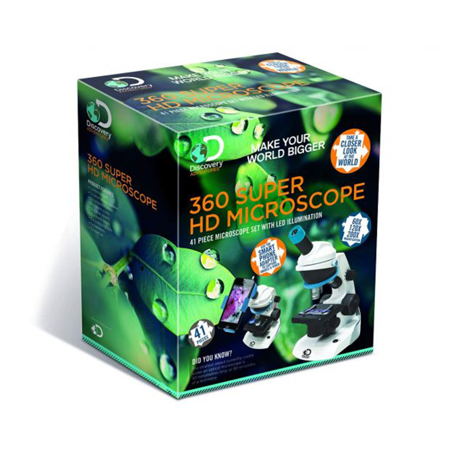 Our most advanced microscope yet – high tech, high definition with superb magnification! With the Discovery Adventures 360 Super HS Microscope you can use your smartphone to capture images and videos of specimens either collected by yourself and with the included prepared slides. This 41 piece set features a 60/120/200X magnification microscope with LED illumination and an adapter for using a smartphone (smartphone not included). This microscope is a STEM toy which encourage children to develop skills in the core disciplines of science, technology, engineering and mathematics. Features and Specifications 3 levels of magnification 60X,120X and 200X Tweezers, 2 sample pots and slide covers Comfortable rubber eyepiece 360 rotating wide-angle eyepiece Smartphone fitting enables samples to be viewed in closer detail and photographed on your phone Includes two per-prepared slides 10 blank slides for collecting and creating specimens for examination The precise focus mechanism and advanced optics provide crystal clear viewing experience Dual LED light with adjustable brightness – samples can be lit up from above and beneath Adjustable contrast filter alters the colour filter for contrast enhancement Requires 3x AAA batteries (not included)