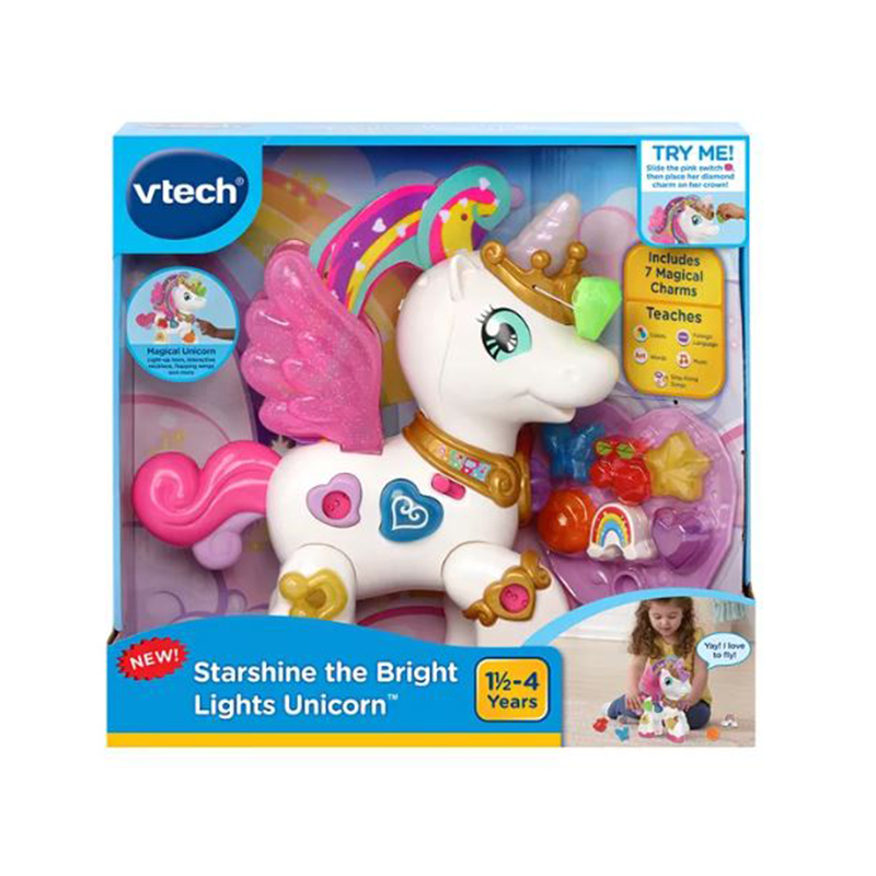 Starshine’s horn lights up in a rainbow of colors; press the blue heart button to hear questions, place the charms on the unicorn to answer. In Music mode, press the heart button to choose a melody, then place the charms on her to add sounds.